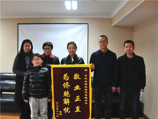 12月17日上午,在浙江投資經商的荷蘭僑胞胡某的女兒胡女士帶著孩子,專程從杭州趕到北京,將一面印有“敬業正直 為僑胞解憂”字樣的錦旗送到中國僑聯,以感謝權益保障部對胡某反映案件的關注和推動。胡女士表示,她代表父親胡某及家人向權益保障部提供的及時、有效法律幫助表達最誠摯的謝意,僑聯不愧是歸僑僑眷和海外僑胞的“貼心人”和“娘家人”。