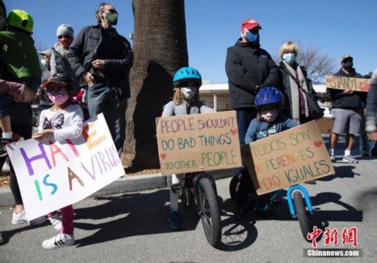 當地時間2月27日,數百人在美國舊金山灣區圣馬特奧市參加反對歧視亞裔的集會。 中新社記者 劉關關 攝