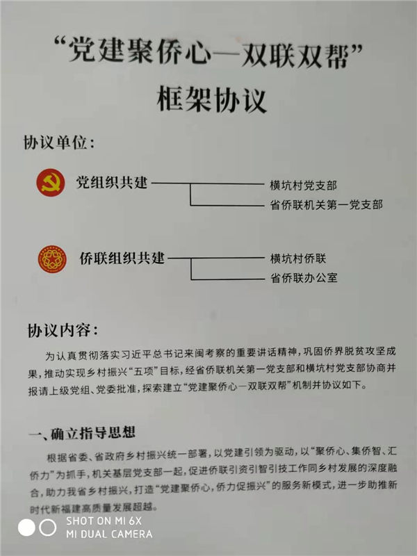 按照“強基層、抓黨建、促振興”的思路,為抓好福建省僑聯《黨建聚僑心·雙聯雙幫助力鄉村振興活動》實施方案,6月19日由省僑聯機關第一黨支部與南平市延平區巨口鄉橫坑村黨支部簽訂“雙聯雙幫”框架協議,開啟了“黨建聚僑心·雙聯雙幫”活動,力爭5年之內達成“八個一”目標:探索一套改進機關作風-推動鄉村振興的雙聯雙幫機制;建立一套機關——鄉村黨建互動機制;幫助擴展一批約300畝耕地(果蔬綜合體采摘基地);在福州幫助擴充一個產生經濟效益平臺;建立一個黨建僑情陳列室;搭建一條民宿旅游線;建立一套橫坑宗親族譜;固定一個平臺。