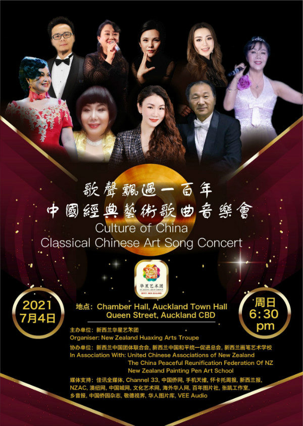“經典歌曲,百年傳唱”,在中國共產黨百年華誕之際,由新西蘭華星藝術團主辦,新西蘭中國團體聯合會、新西蘭中國和平統一促進總會、新西蘭畫筆藝術學校聯合協辦的《歌聲飄過一百年-中國經典藝術歌曲音樂會》于2021年7月4日周日晚在奧克蘭市政大廳室內音樂廳(Concert Chamber of Auckland Town Hall )成功舉辦!由中華人民共和國國務院新聞辦公室和駐奧克蘭總領事館主辦的《中國共產黨的100年》圖片展以及音樂會演出前酒會也圓滿成功!活動受到了社會各界的高度關注和一致好評!
