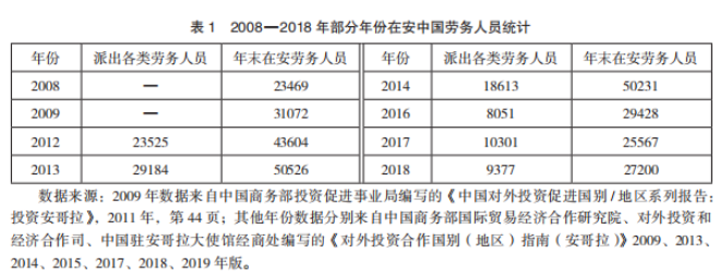 安哥拉是撒哈拉以南非洲第三大經濟體、中國第三大石油供應國、在非洲的第二大貿易伙伴和重要工程承包市場。2002年安哥拉內戰結束之前,安哥拉中國移民數量長期徘徊在250~550 人之間。中國人大規模進入始于2004 年中國與安哥拉達成以“石油換貸款”為內容和特色的兩國合作的“安哥拉模式”之后,此后數量持續快速增長。2012—2014 年間達到峰值約26 萬人,僅次于南非(約30萬人),當時安哥拉全國總人口約2000萬,相當于每百人中就有1名中國人;2015年開始在安中國人大量回國,數量下降了40%~50%;截止到2019年底,僅剩6萬~8萬人,減少了近70%,居南非(約30萬)、尼日利亞(約20萬)之后。中資企業承建的工程停工、安哥拉經營環境及社會治安持續惡化是中國新移民回流的主要原因。