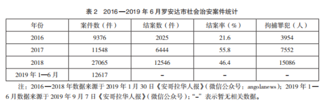 2014年下半年,因國際油價暴跌,安哥拉經濟陷入困境,2016年以后GDP曾連續三年負增長,失業率多年在28%的高位徘徊,15~24歲青年群體失業率更是高達52.4%。嚴重的社會不平等和高貧困率導致暴力犯罪成為在安外國人面臨的最大安全威脅,被不明武裝人員搶劫司空見慣。以羅安達市為例,2016年至2019年上半年,治安案件大幅上升(見表2)。