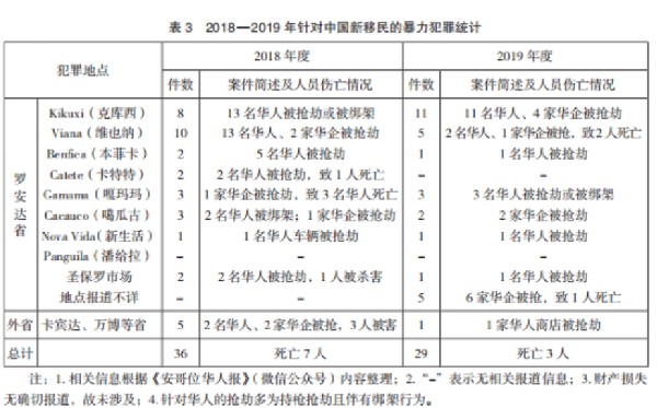 梳理《安哥拉華人報》(微信公眾號)相關報道發現,犯罪地點主要集中在“高速路”沿線,克庫西(Kikuxi)和維也納(Viana)兩地是案件高發地區,安防壓力較大,其他地區相對較輕;犯罪分子主要是安哥拉人,鮮見中國人對同胞犯罪,說明中國公安部跨國打黑除惡效果明顯;針對中國新移民的暴力犯罪多以搶劫錢物、綁架索要贖金為目的;造成中國新移民死亡的案件多是身邊或華企內部安哥拉員工作案。