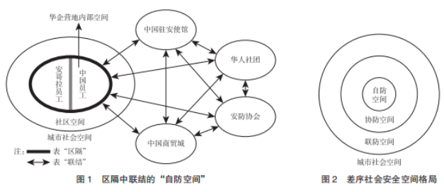 面對安哥拉日趨惡化的社會治安環境,中國新移民并未坐以待斃或一走了之,而是積極行動起來,聯合開展安全自救,展現高度的行動自覺和族群團結,在異國他鄉共建、共享社會安全空間。經過十多年的努力和探索,中國新移民從營造“自防空間”開始,扎緊華企營地及其內部安全空間的籬笆,自我構建安全空間。組織并加入區域安防協會,形成“協防空間”,盡管沒有“自防空間”那樣立竿見影的安全效果,但中國新移民還是愿意“花錢買平安”,參與共建華人社區安全空間。為整合華人安防力量,中國駐安使館促成各區域安防協會聯合組建“安聯會”,協助使館為新移民提供免費安防服務,在族裔聚集區打造“點—線—面”相結合的立體安全防護體系和保護網絡,形成以“自防空間”為中心、呈水波紋狀向外延展的差序社會安全格局(見圖2)。