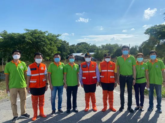 抵達(dá)信武里府時(shí),府尹率當(dāng)?shù)毓賳T迎接并帶領(lǐng)救災(zāi)小組深入災(zāi)區(qū)。由于連日暴雨,路面積水超過(guò)一米,必須劃船進(jìn)入,期間各救災(zāi)人員也有趟著水走進(jìn)去,洪水沒(méi)過(guò)小腿,接近淹到人的腰部。