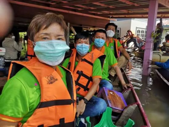 泰國(guó)泉州晉江聯(lián)合總會(huì)會(huì)長(zhǎng)蔡上新、執(zhí)行會(huì)長(zhǎng)陳俞龍、副會(huì)長(zhǎng)許清流、洪世界、張孚杰、常務(wù)理事黃淑芬、顧問(wèn)許宗會(huì)乘小船進(jìn)入災(zāi)區(qū)