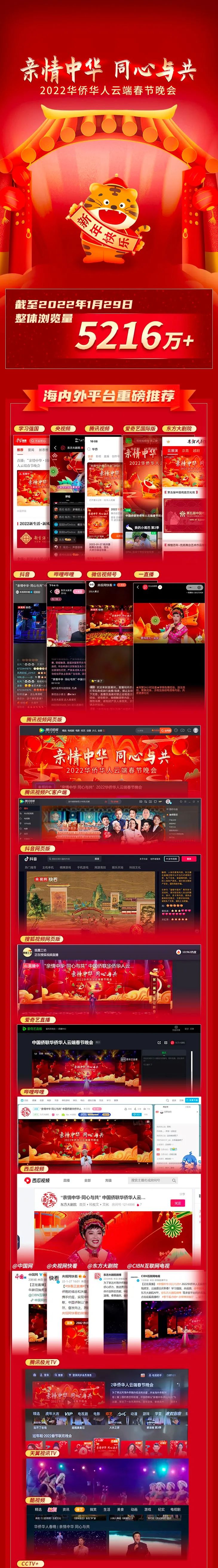 由中國僑聯主辦的“親情中華·同心與共”2022華僑華人云端春節晚會于1月27日16:00(農歷臘月二十五)通過20余家網絡平臺播出,截至1月29日10:00,觀看量累計超過5216萬人次。