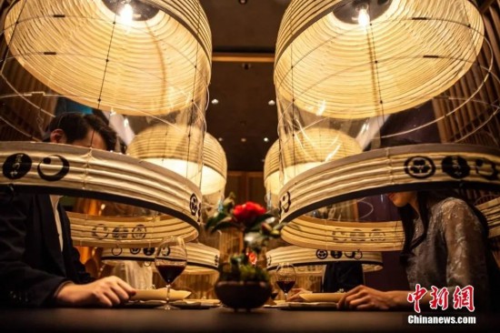 當地時間2月28日,日本東京一家酒店設置的用餐防護罩,旨在疫情期間保持安全社交間距。圖源:視覺中國