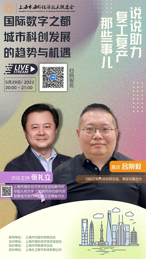 5月29日晚,由上海市僑聯指導、上海市海外經濟技術促進會主辦、上海市僑聯青年總會協辦、上海禮之數字科技有限公司承辦的“說說助力復工復產那些事”企業訪談系列視頻講座第七場暨“國際數字之都城市科創發展的趨勢與機遇”成功舉辦,本期的訪談嘉賓為G60云智天地招商總監、海促會副會長呂剛毅,訪談主持人為上海市海外經濟技術促進會秘書長張禮立博士,線上約340余位社會各界人士以視頻方式聽取了本次視頻講座。