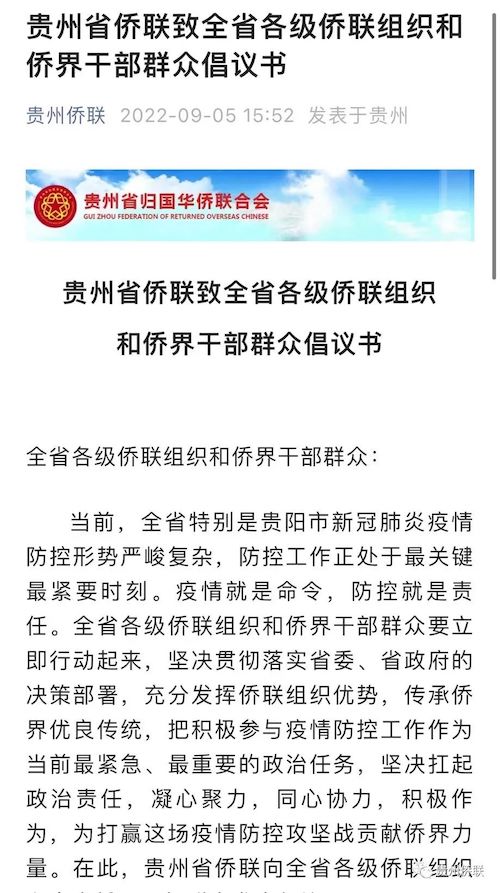 9月5日,貴州省歸國華僑聯合會發出《貴州省僑聯致全省各級僑聯組織和僑界干部群眾倡議書》,全省僑界積極響應。