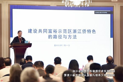 溫州大學商學院教授張一力的主旨分享題為“共同富裕示范區建設的浙江僑特色研究”。張一力分析了浙江省的基本僑情與特點,提出了高質量發展建設打造共同富裕示范區浙江僑特色的路徑和方法,如全球數字貿易中心建設、強化高校僑留聯+海外浙商協會的全球科創資源集聚機制等,并提出了具體的對策與建議。