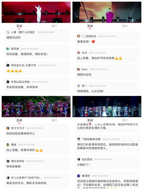 3月30日,“親情中華·千姿百色·走進(jìn)靖西”暨“廣西三月三·鄉(xiāng)音播全球”文藝慰問演出在地處祖國(guó)西南邊陲、壯歌之鄉(xiāng)——廣西百色靖西市舉辦。中國(guó)僑聯(lián)文化交流部副部長(zhǎng)邢硯莊,廣西僑聯(lián)黨組書記、主席陳潔英,百色市委常委、統(tǒng)戰(zhàn)部部長(zhǎng)閆炳辰等出席晚會(huì)并致辭,百色市直有關(guān)部門和靖西市領(lǐng)導(dǎo)及相關(guān)部門領(lǐng)導(dǎo)、部分歸僑僑眷、海外僑胞、僑商代表以及各界群眾1000余人在現(xiàn)場(chǎng)觀看演出。海內(nèi)外190多萬人次通過“華人頭條”“中新網(wǎng)”等海內(nèi)外媒體觀看了直播。