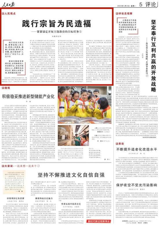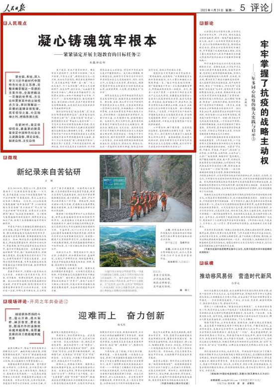 當前,全黨正在開展學習貫徹習近平新時代中國特色社會主義思想主題教育。習近平總書記從新時代新征程黨和國家事業發展全局的戰略高度,深刻闡述開展主題教育的重大意義和目標要求,明確提出了開展主題教育的根本任務和具體要達到的五個方面目標。人民日報推出系列評論,與讀者一起深入探討,貫徹落實。