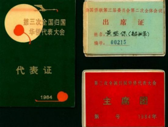 菲律賓歸僑黃登保出席第三次全國歸國華僑代表大會代表證、主席團證、出席證