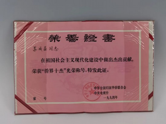 中國僑聯、中央電視臺聯合頒給蘇成益“僑界十杰”稱號榮譽證書