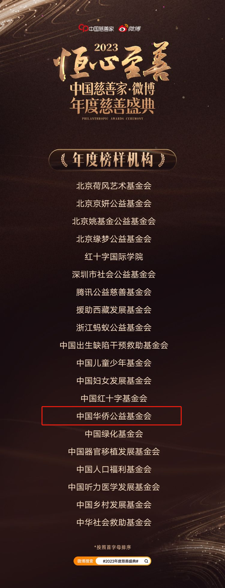 1月8日,由《中國慈善家》雜志和微博共同主辦的“恒心至善”2023年度慈善盛典,在北京國際會議中心隆重舉行。中國華僑公益基金會榮獲2023年度慈善盛典年度榜樣機構。