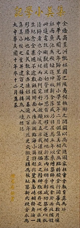 “教育為立國之本,興學乃國民天職。教育不振則實業不興,國民之生計日絀……”陳嘉庚紀念館里懸掛的這些話語,是昔日陳嘉庚常提起的。1911年辛亥革命成功,陳嘉庚備受鼓舞,“思欲盡國民一分子之天職”。次年,他回到家鄉。村中孩童衣不蔽體、成群失學、嬉游賭博的情景刺痛了他,更堅定了他興學辦校的信念。回鄉第二年,陳嘉庚創辦了集美小學。現在,紀念館還保留著他當年寫的集美小學記。