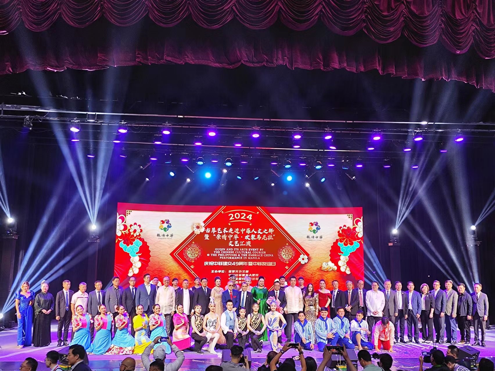 在菲演出正值中菲建交49周年暨第23個“中菲友誼日”之際,由中國駐菲律賓使館、菲律賓外交部、中國僑聯和菲華各界聯合會聯合主辦,并融合中國駐菲律賓“中菲人文之驛”活動。中國駐菲律賓大使黃溪連,菲參議員艾美代表、馬科斯總統中心主任伊萊莎·羅慕德爾茲,菲華各界聯合會主席蔡永寧,帕賽市長卡利西托,馬尼拉副市長涅托等出席活動并致辭。菲參議長埃斯庫德羅、外交部長馬納羅視頻致辭。菲總統中國事務特使許智鈞、顏杰奇,菲外交部副部長助理漢斯,菲軍前副總長安東尼,菲前副國安顧問班樂義,菲華商聯總會理事長施東方和有關華社負責人,以及菲政府、軍警、地方省市、工商界、媒體、智庫、高校、華僑華人等代表千余人參加。黃溪連致辭表示,多樣帶來對話,對話孕育融合,融合產生進步。尊重文明多樣性、推動文明交流互鑒,既是中華文化對世界文明兼收并蓄的歷史來時路,更是我們共同推動人類文明不斷進步的未來奮進路。希望以此次活動為契機,激發中菲社會各界參與兩國人文交流合作的熱情,深化文明交流互鑒,促進民心相知相通。