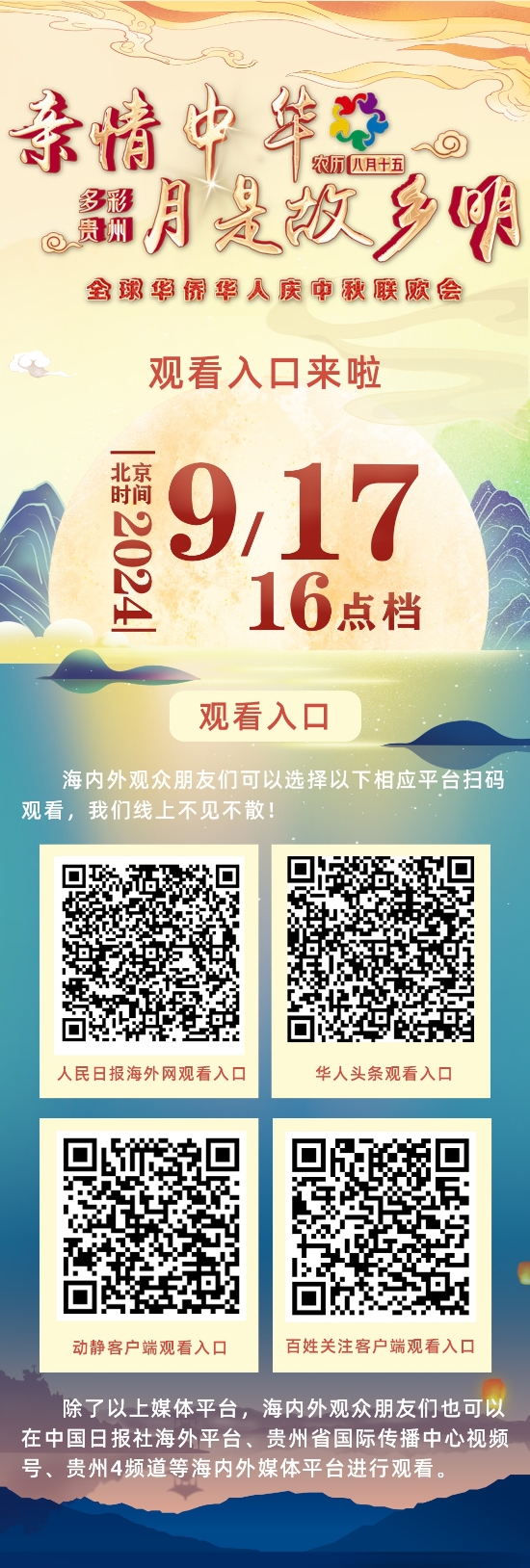 明天北京時間16時,“親情中華·月是故鄉明”全球華僑華人慶中秋聯歡會正式上線,屆時將通過人民日報海外網、中國日報社海外平臺、華人頭條、貴州省國際傳播中心抖音號、貴州4頻道、動靜新聞客戶端、百姓關注客戶端等海內外媒體平臺同步播出。