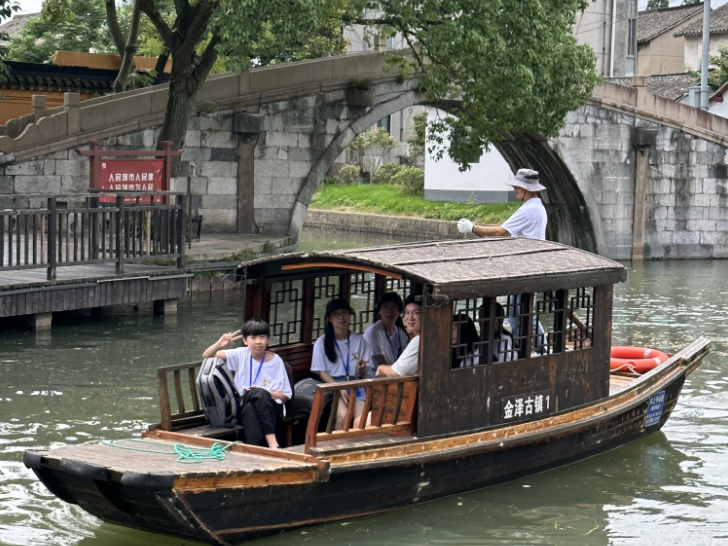 位于青浦區的金澤古鎮,是典型的江南魚米水鄉。鎮上至今還保存著宋元明清所建的七座古橋梁。營員們來到金澤古鎮,在云煙氤氳中體驗江南的水鄉文化,在煙波浩渺中感受傳統手工工藝的魅力。搖櫓起行,水波搖動,營員們坐在古色古香的小舟上,領略兩岸風光,盡賞古橋風韻。游船上,營員們紛紛拿出手機拍照留影。