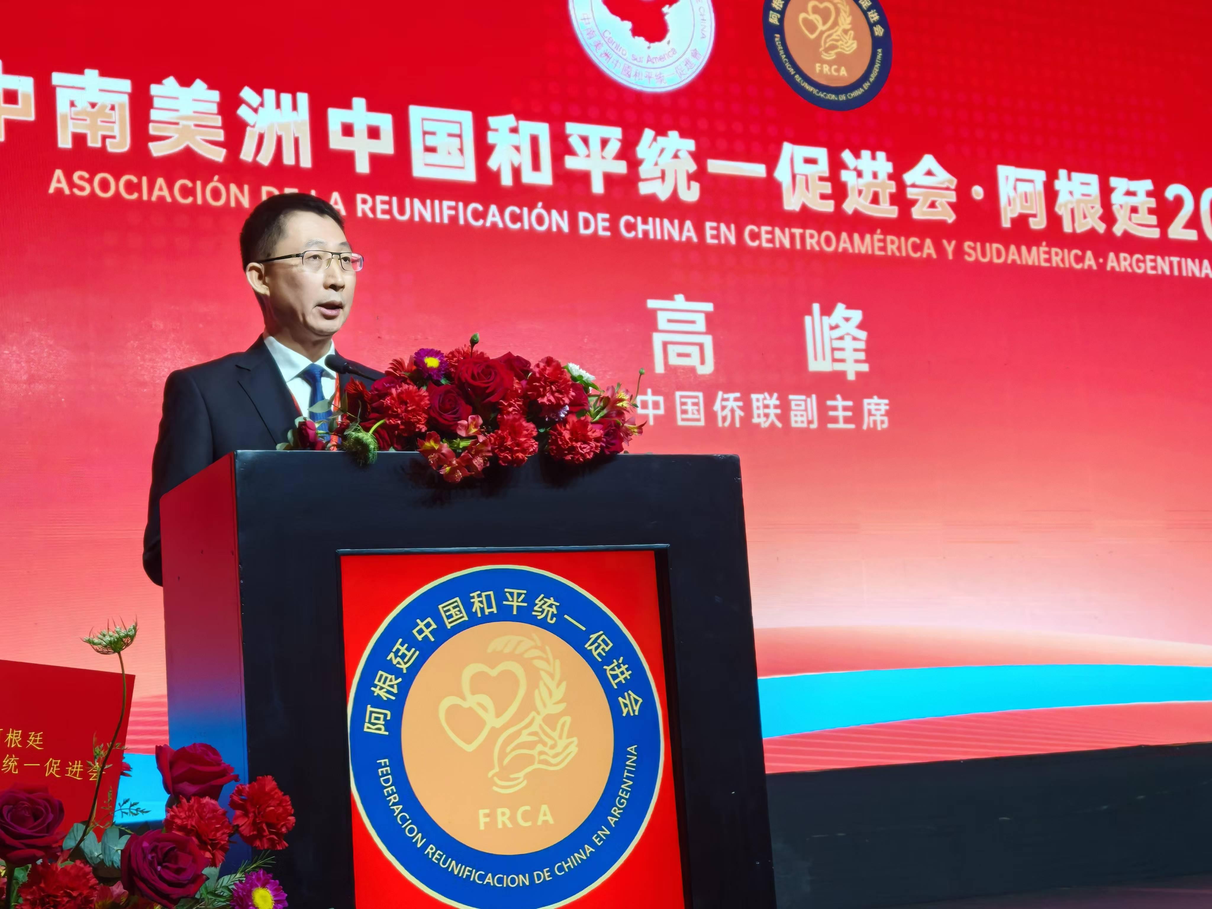 在阿根廷,高峰出席中南美洲中國和平統一促進會2024年布宜諾斯艾利斯年會并致辭。他首先代表中國僑聯和萬立駿主席對大會的召開表示熱烈祝賀,向為促進中國統一和民族復興付出不懈努力的僑胞朋友們致以崇高的敬意和衷心的感謝。他表示,廣大旅居中南美洲的僑胞朋友們胸懷大義、團結一致,無私無畏、堅守正道,各展所長、各盡其力,積極開展反“獨”促統活動,并增進中國和中南美洲各領域交流交往。他希望廣大海外僑胞更加積極主動地推進兩岸交流交往,不斷深化兩岸融合發展;秉持和弘揚優良傳統,團結一致,堅決反對“臺獨”和外部勢力干涉,堅守中華民族共同家園;攜手并肩,砥礪奮進,跑好歷史接力棒,為進一步全面深化改革,以中國式現代化全面推進中華民族偉大復興貢獻更多智慧和力量。