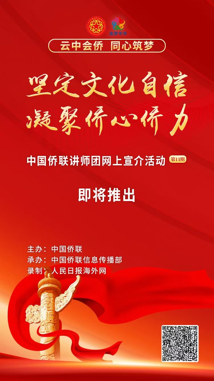 為深入學習貫徹習近平文化思想,錨定建成文化強國的戰略目標,堅定文化自信,不斷發展新時代中國特色社會主義文化,不斷提升中華文化影響力,筑牢強國建設、民族復興的文化根基,激勵僑界群眾在奮進新征程中作出新貢獻,中國僑聯精心策劃錄制并即將推出講師團網上宣介(第十一期)視頻。