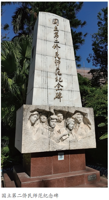 矗立在校門內(nèi)的國立第二僑民師范紀念碑,是由僑二師校友自發(fā)捐資和廣州市教委撥款于1998年建立的,銘記著往昔崢嶸歲月。