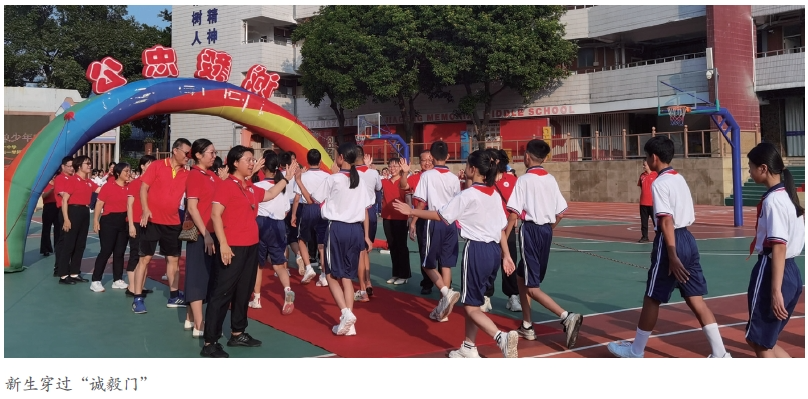 廣州市陳嘉庚紀念中學的開學典禮有一個傳統(tǒng):新生入學都要穿過一道“誠毅門”。青春洋溢的少年們踩著紅毯,在分列于拱門兩旁的老師的歡迎下,有序地穿過“誠毅門”,成為一名嘉庚學子。開學的第一課則是“誠毅忠公”思想教育課。每屆新生入學,老師都安排這節(jié)課,向學生講述源于“嘉庚精神”的校訓——“誠毅忠公”的內(nèi)涵:誠——誠實,誠以為國,誠信待人,實事求是;毅——堅毅,毅以處事,追求理想,艱苦奮斗;忠——愛國,忠于國家,心懷天下,關心民生;公——責任,大公無私,服務他人,奉獻社會。