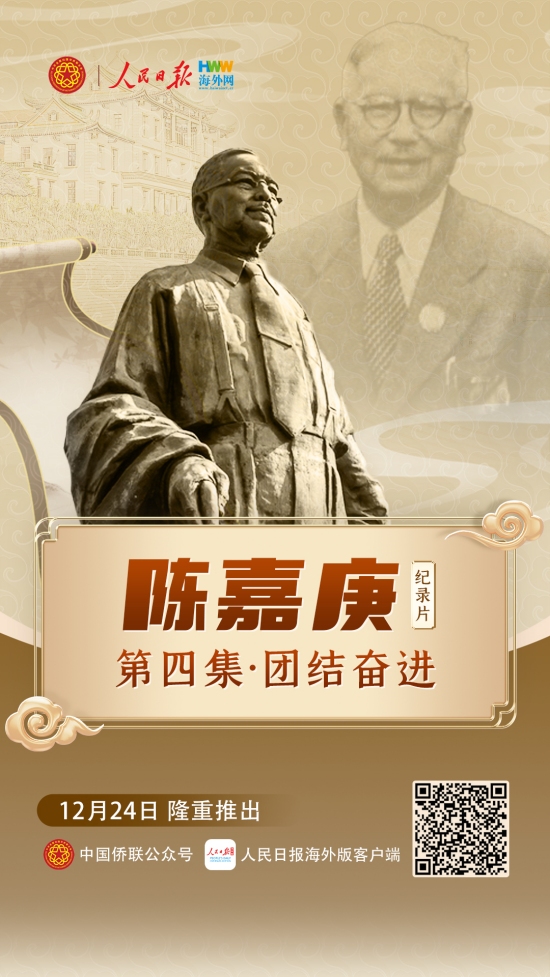 今年是陳嘉庚先生誕辰150周年,為深入學習貫徹習近平總書記2014年給廈門集美校友總會的重要回信精神,弘揚新時代嘉庚精神,激發僑心向黨、團結奮斗的強大力量,中國僑聯指導人民日報海外網拍攝制作了四集紀錄片《陳嘉庚》。第四集《團結奮進》講述了中國僑聯弘揚新時代嘉庚精神,團結凝聚僑心僑智僑力同圓共享中國夢的探索和實踐。