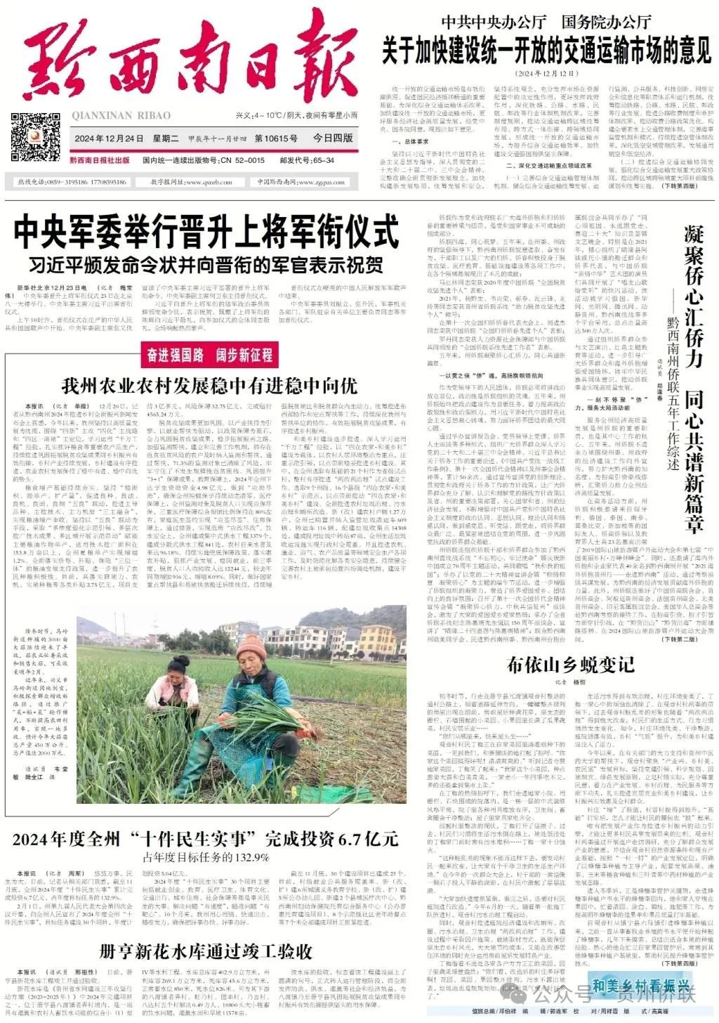 此外,州僑聯還邀請了中國僑聯“親情中華”藝術團分別在興義市和晴隆縣舉辦了以“助力鄉村振興 慶祝中國共產黨成立100周年”為主題的“親情中華”慰問演出,為黔西南的各族群眾以及歸僑僑眷近3000人帶來了一場文藝盛宴。同時,組織州內的歸僑僑眷代表到現場觀看《音畫布衣》大型文藝匯演,進一步增強了僑聯組織的凝聚力與向心力,助力中華優秀民族文化的傳播。州僑聯還積極開展“親情中華·為你講故事”網上夏令營活動,通過微信群推送宣傳片、講中國故事等方式,全方位、多角度、深層次地講好中國故事、貴州故事、黔西南故事,并向海外華裔青年推送了黔西南的景點、美食和文化,累計組織了8期夏令營活動。以及協助中央電視臺國防軍事頻道欄目組赴晴隆“二十四道拐”拍攝了以南僑機工蔣印生為題材的《最后的南僑機工》節目,講述南僑機工的故事,以華僑精神為紐帶發揚愛國主義精神。以2023國際山地旅游暨戶外運動大會為契機,誠邀海外僑胞參與“萬馬奔騰”“加油奔跑 興義真好”視頻宣傳活動,通過海外華人華僑的獨特視角,向世界展示黔西南的魅力。2024年“僑連五洲·聚力貴州——黔西南山地旅游加油之旅”活動取得了顯著成效,40多家華文媒體共發布信息500余條(次),覆蓋全球受眾超過2億人(次)。其中,德國《僑報》、泰國《星暹日報》、印尼《印華日報》、埃及《中國周報》等媒體對黔西南進行了持續深入的報道。