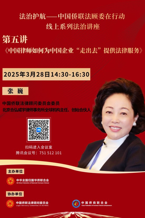 第五講將于3月28日(周五)14:30開播,由中國僑聯(lián)法顧委民事經(jīng)濟專委會副主任,北京合弘威宇律師事務(wù)所全球機構(gòu)主任、創(chuàng)始合伙人張巍律師主講,題目是《中國律師如何為中國企業(yè)“走出去”提供法律服務(wù)》。聽課鏈接參見下方海報。