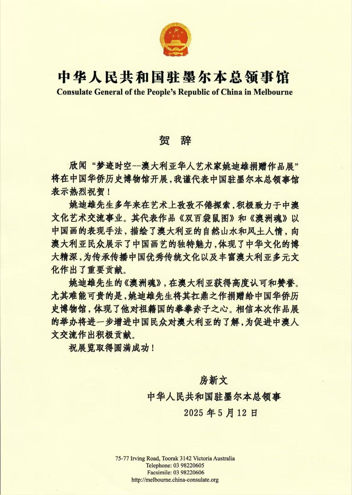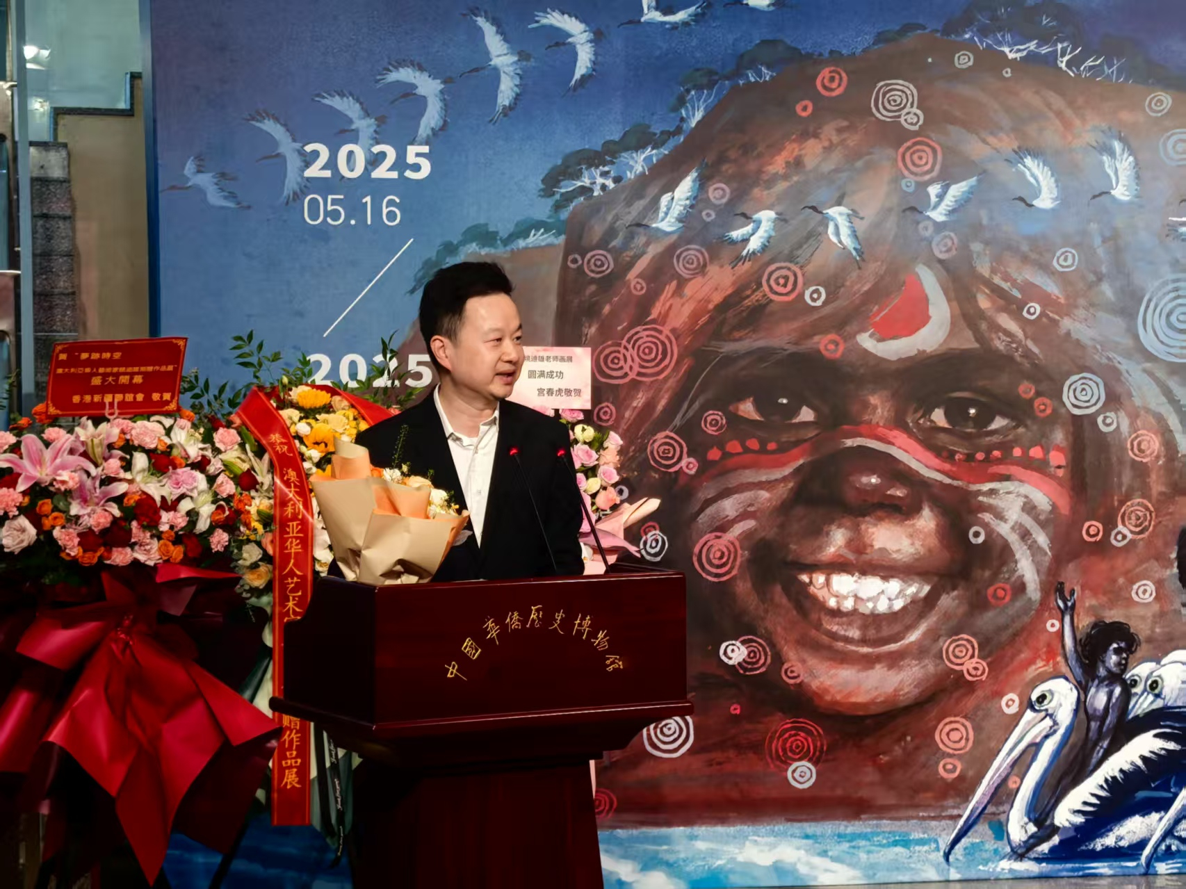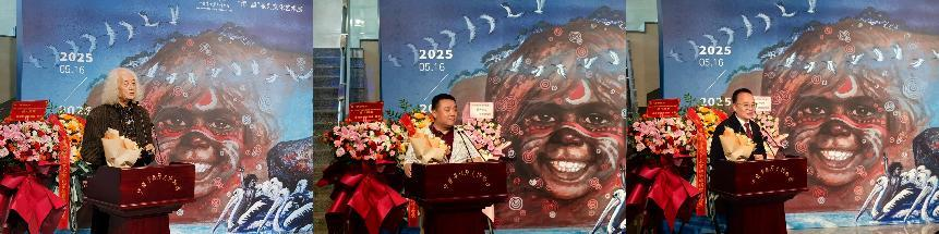 寧一在致辭中表示,“夢”是人類前行的動(dòng)力源泉,華僑華人有著自己獨(dú)特而宏大的夢想。華僑華人無論身處何方,都懷揣著家族興旺、家國繁榮的夢想。中國夢,凝聚著全體中華兒女的共同期盼,海外僑胞作為其中重要的一部分,以各種方式積極參與中國的發(fā)展,為實(shí)現(xiàn)中國夢貢獻(xiàn)自己的力量。構(gòu)建人類命運(yùn)共同體是全人類的共同夢想,通過藝術(shù)交流,我們能夠打破隔閡,促進(jìn)不同國家、不同民族之間的理解與合作,攜手邁向人類命運(yùn)共同體的美好未來。“跡”是個(gè)人的行跡與經(jīng)歷,更是人類文明在世界上留下的印記。姚迪雄先生四十年來的跨文化創(chuàng)作歷程,不僅是他個(gè)人的成長軌跡,更是無數(shù)華僑華人在海外拼搏的縮影。他們?cè)诓煌膰龋米约旱闹腔酆颓趧冢瑸楫?dāng)?shù)氐陌l(fā)展貢獻(xiàn)力量,同時(shí)也將中華文化傳播到世界各個(gè)角落,在人類文明的長河中留下了獨(dú)特的印記。這些痕跡見證了華僑華人在百年未有的變局中,堅(jiān)守文化根脈,積極融入當(dāng)?shù)厣鐣?huì)的努力,成為世界了解中華文化包容性的重要窗口。“時(shí)”是最忠實(shí)的記錄者,時(shí)間見證了藝術(shù)家的成長與蛻變。姚迪雄先生在漫長的藝術(shù)生涯中,不斷積累、沉淀,其創(chuàng)作風(fēng)格隨著時(shí)間的推移逐漸成熟。多年來,華僑華人作為中外交流的重要力量,在不同時(shí)期發(fā)揮著關(guān)鍵作用。他們促進(jìn)了文化、經(jīng)濟(jì)、科技等多領(lǐng)域的交流,藝術(shù)交流作為其中的重要組成部分,也在時(shí)間的推動(dòng)下不斷發(fā)展、深化。“空”是空間,華僑華人作為跨越國界的使者,在不同的空間和文明之間架起了溝通的橋梁。《澳洲魂》長卷跨越了地域空間,展現(xiàn)出兩種文明在藝術(shù)空間中的對(duì)話。在現(xiàn)實(shí)生活中,華僑華人活躍于世界各地,將中華優(yōu)秀文化的魅力傳遞到海外,同時(shí)也把海外先進(jìn)的文化、理念帶回中國。他們?cè)诓煌拿鞯目臻g中穿梭,促進(jìn)中外文明的交流互鑒,讓不同的文化在交流中綻放光彩,實(shí)現(xiàn)“各美其美、美美與共”。