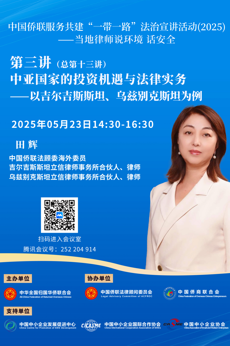 今年第三講(總第十三講)將于2025年5月23日(周五)14:30開播,由中國僑聯法顧委海外委員吉爾吉斯斯坦田輝律師主講。田輝律師畢業于北京外國語學院俄語系,1996年前往獨聯體國家留學,畢業于莫斯科企法學院(吉爾吉斯)法學專業,獲得吉爾吉斯共和國政府下屬國家法學院碩士學位,現為吉爾吉斯斯坦立信律師事務所合伙人、烏茲別克斯坦立信律師事務所合伙人,曾兼任吉爾吉斯共和國政府下屬國家法學院客座教授、吉爾吉斯共和國賈拉拉巴德州州長顧問等職,現兼任吉爾吉斯斯坦中國總商會法律顧問。田律師在獨聯體國家工作近三十年,曾從事法律服務、招商引資、企業經營管理等工作,具有豐富的獨聯體市場開拓和經營管理經驗,通曉獨聯體各國法律和市場規則,常年為在中亞的中資企業提供法律咨詢和法律實務服務。