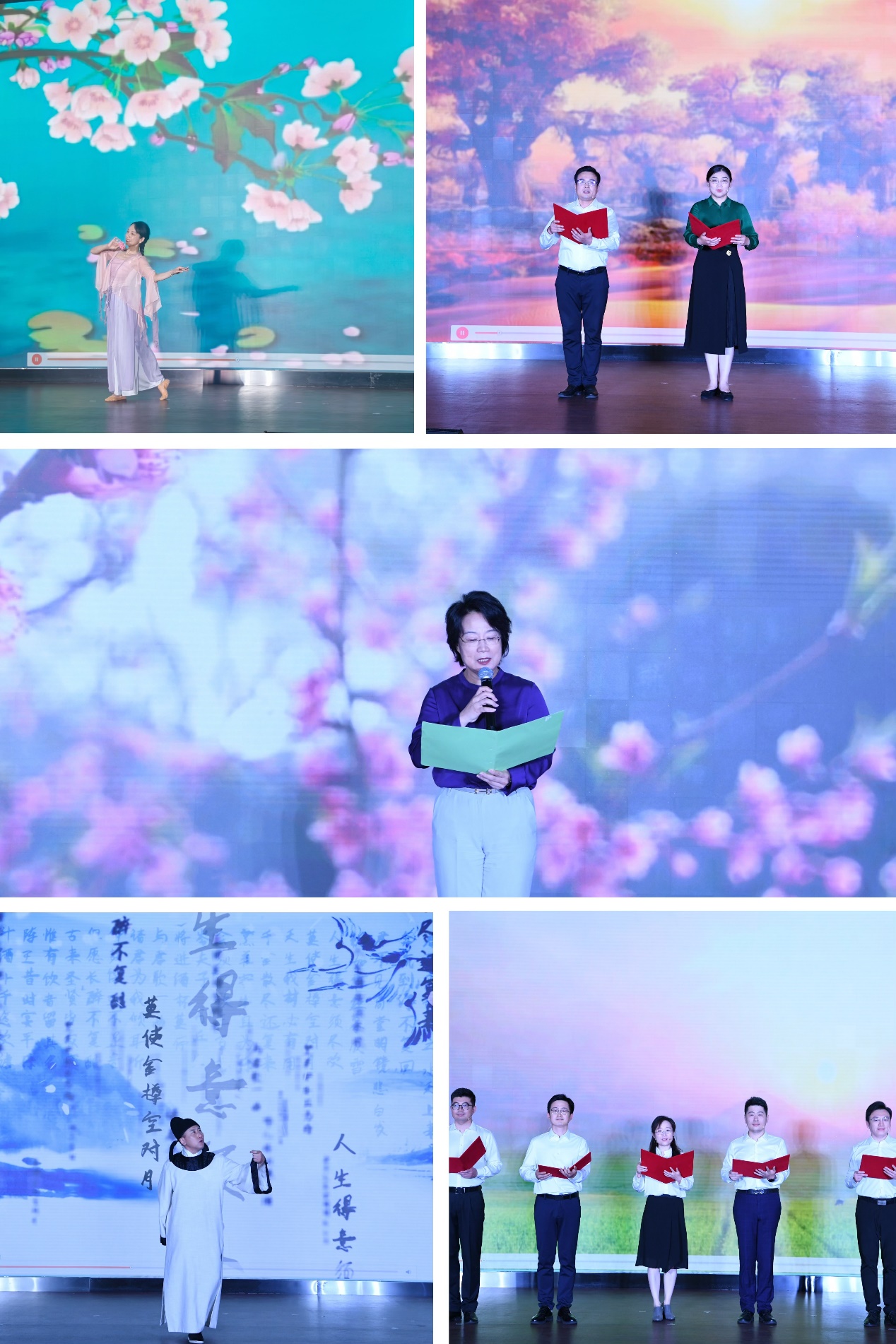 伴隨著聯誼聯絡部吳婷的古典民族舞蹈《相思瑤》優美輕盈的舞姿,分享會進入“頌春·書趣聲聲”環節。聯誼聯絡部盧琳琳、經濟科技部鐘航朗誦阿紫的《生如胡楊》深情激昂,機關服務中心徐巍演繹李白的《將進酒》沉醉動人,直屬機關工會主席劉紅誦讀朱自清的《春》清新委婉,辦公廳王斯倩、趙若晨、聯誼聯絡部李潤洲、中國華僑歷史博物館張子彬、組織人事部陳志博共同朗誦阿紫的《和春天上路》熱情奔放。他們用聲音演繹情感,用語言叩擊心靈,讓現場觀眾為一首首名篇而感動,為一篇篇經典而陶醉。