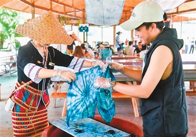 圖為印尼博主陳浩杰(右一)在海南檳榔谷黎苗文化旅游區體驗苗族扎染。 海南省國際文化交流中心供圖 |