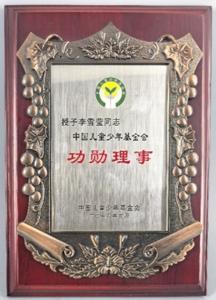 榮譽里的擔當:中國兒童少年基金會頒發的“功勛理事”獎牌,這是李雪瑩退休后仍在延續的公益事業印記。