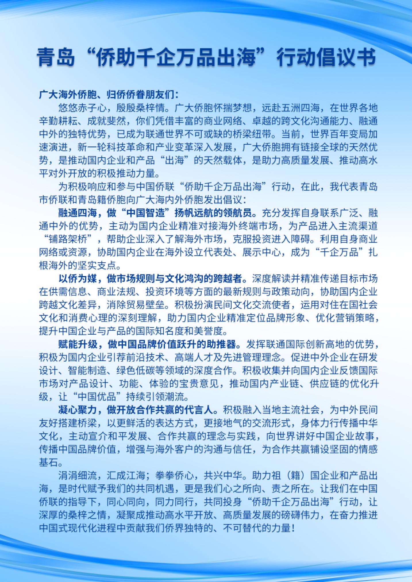程紅、李興鈺等與會領導和僑界企業家代表共同啟動青島“僑助千企萬品出海”行動,標志著青島將深度參與由中國僑聯發起的這一全國性行動,利用僑界資源網絡,助力本地企業和產品“走出去”。會上,宣讀了《青島“僑助千企萬品出海”行動倡議書》,該倡議立足國家開放發展大局,從“融通四海,做‘中國智造’揚帆遠航的領航員”;“以僑為媒,做市場規則與文化鴻溝的跨越者”;“賦能升級,做中國品牌價值躍升的助推器”;“凝心聚力,做開放合作共贏的代言人”等四個方面,向廣大華僑華人發出攜手開拓企業和產品出海新境界的號召。