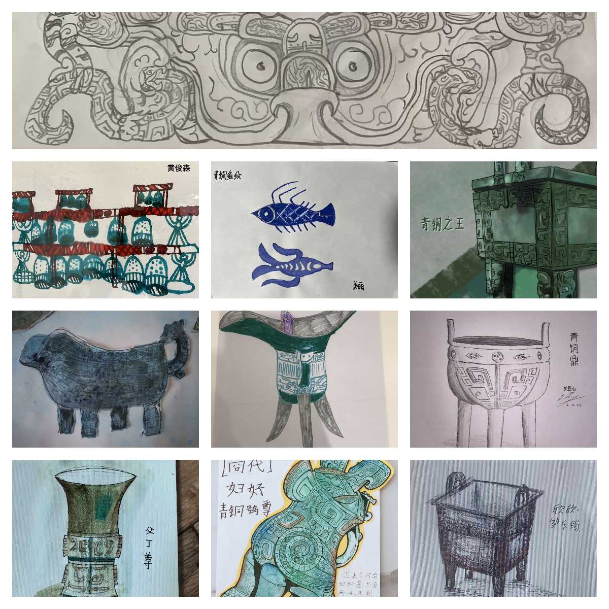 作為“商都”的代表性符號,商代青銅器在營員筆下煥發光彩。他們憑借精湛畫藝,令婦好鸮尊、后母戊鼎、編鐘等器具躍然紙上,更以細膩工筆,精妙再現了青銅魚紋、饕餮紋等紋飾的韻味。