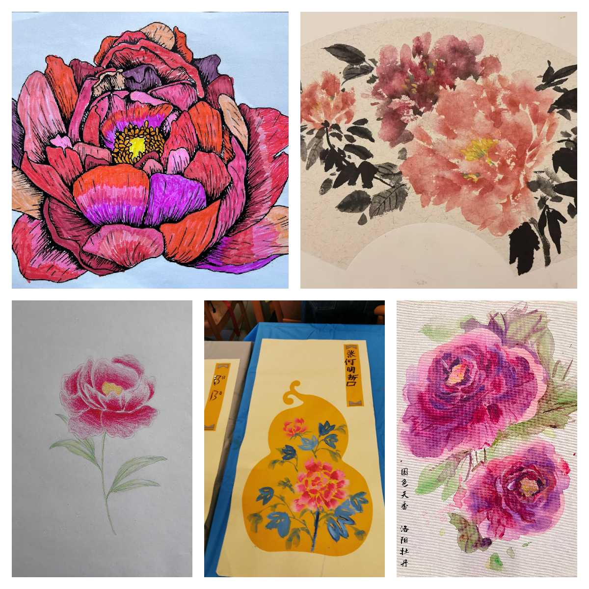 洛陽牡丹甲天下,營員們妙筆生花,牡丹之色、之態、之神與不同畫風相結合,無論是姹紫嫣紅的萬千花色,豐腴典雅的花容,還是蘊含其中的富貴天香,都被呈現得栩栩如生,紙上留芳華。