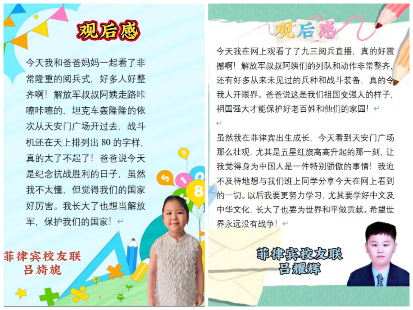 菲律賓校友聯(lián)營員施雅祺表示,今天隔著屏幕看完了九三閱兵,眼眶濕濕的。今天的中國不再是中文書里黑白照片的滄桑模樣,她眉宇間有風(fēng)雷激蕩,步履中有山河回響。這份驕傲不需要翻譯,卻永遠(yuǎn)能穿透所有距離與隔閡。當(dāng)戰(zhàn)機劃過湛藍(lán)的天幕,我在評論區(qū)打下:“此生幸擁炎黃血,來生愿在種花家。”——這或許就是海外華裔最真摯的告白,此刻耳邊依然回蕩著“正義必勝、和平必勝、人民必勝”!愿祖籍國繁榮昌盛,國泰民安!營員蔡瀚文表示,我們要謹(jǐn)記牢記初心、不負(fù)使命、守護和平、捍衛(wèi)正義。作為海外華裔青少年,我們雖然身在異國他鄉(xiāng),但祖國的歷史,我們將永遠(yuǎn)銘記。我們愛您,偉大的祖國。我們愛您,英雄的人民。