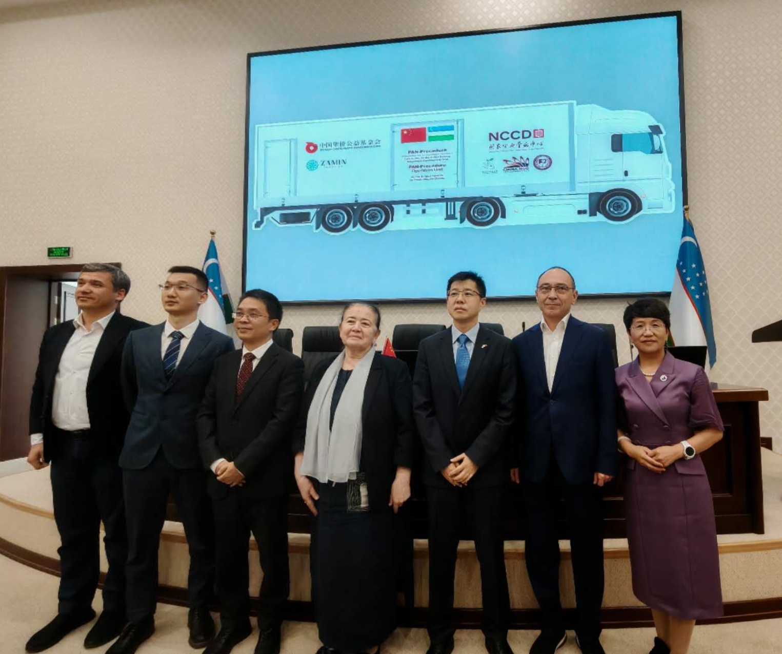 在與會嘉賓的見證下,舉行了移動手術(shù)車的象征性交接儀式。鄭曉輝代表基金會向烏方捐贈該醫(yī)療設(shè)備,烏茲別克斯坦衛(wèi)生部副部長埃爾米拉·巴西特哈諾娃代表烏方見證并接收了車輛模型。該移動手術(shù)車將待實際運抵后正式投入服務(wù)。