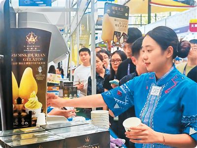 在東盟國家展區馬來西亞館,一款造型酷似榴蓮果肉的冰激凌成了“明星展品”,人們在“榴蓮大哥”品牌展位前排起長隊。“第二次來東博會,展位大了一倍,人也多到忙不過來!”馬來西亞“榴蓮大哥”集團負責人吳聯波正忙著招呼顧客。