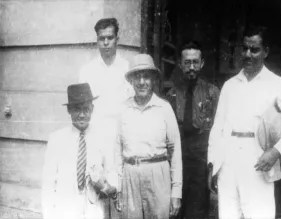 左圖為吳云燦(右二)與出發(fā)去延安的印度醫(yī)療隊合影;右圖為荷屬華僑醫(yī)療隊徽章