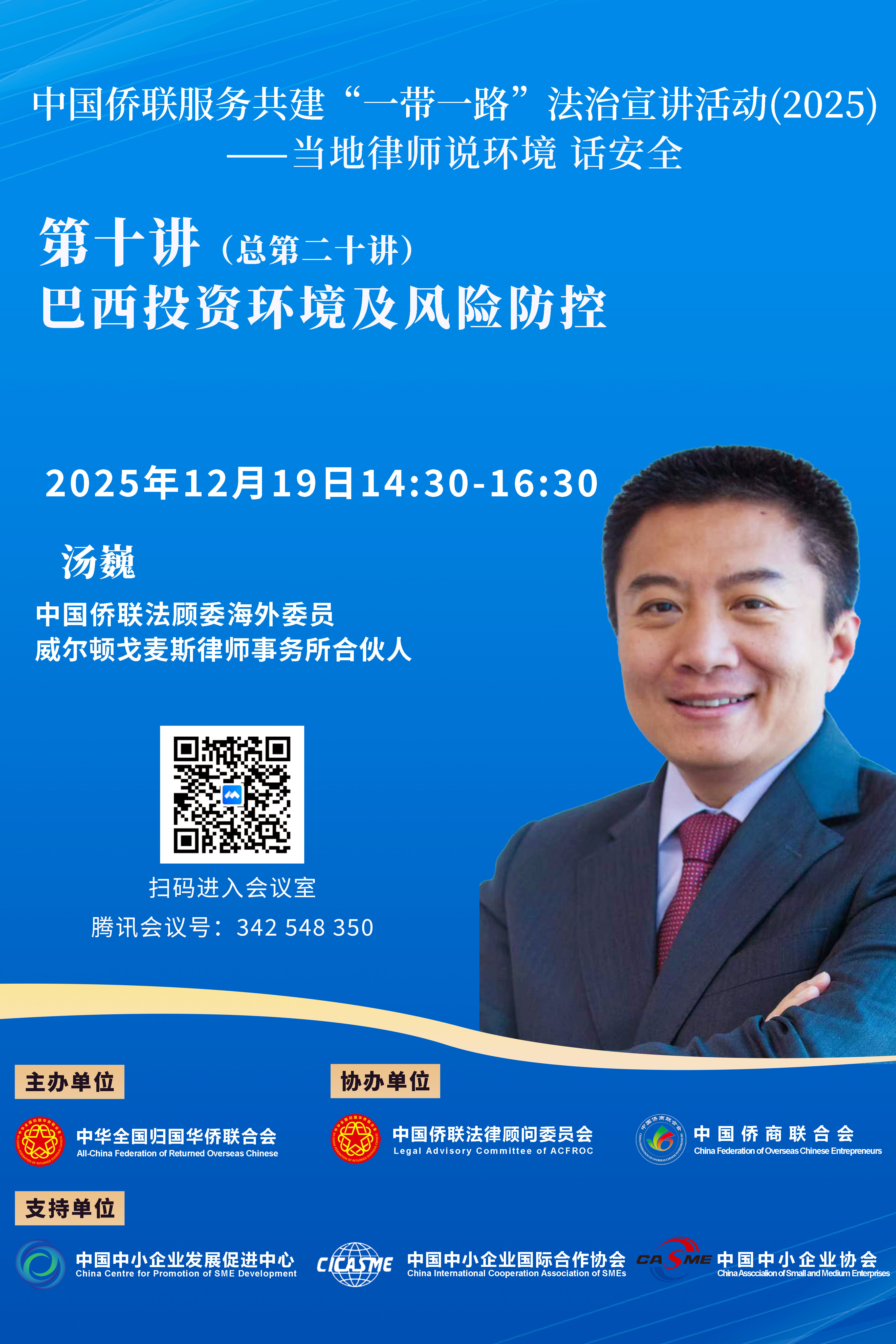 今年第十講(總第二十講)將于2025年12月19日(周五)14:30開播,由中國僑聯法顧委海外委員巴西湯巍律師主講。湯巍律師畢業于巴西圣保羅大學法學院,在巴西從事律師工作二十余年,精通巴西民法、公司法、行政法,尤其在外商投資、國際貿易及基礎設施建設等領域擁有深厚造詣。湯律師同時在巴西華人協會、巴西廣東同鄉總會等多家僑團擔任重要職務,致力于為巴西當地華人華僑、中資企業及中國駐巴西使領館提供專業法律服務。